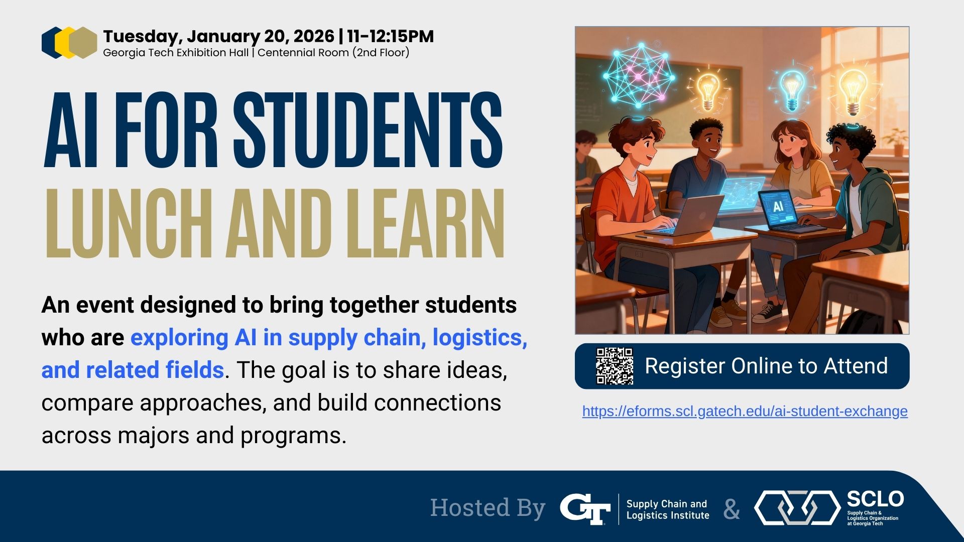 The event is designed to bring together Georgia Tech students who are exploring AI in supply chain, logistics, and related fields. The goal is to share ideas, compare approaches, and build connections across majors and programs.