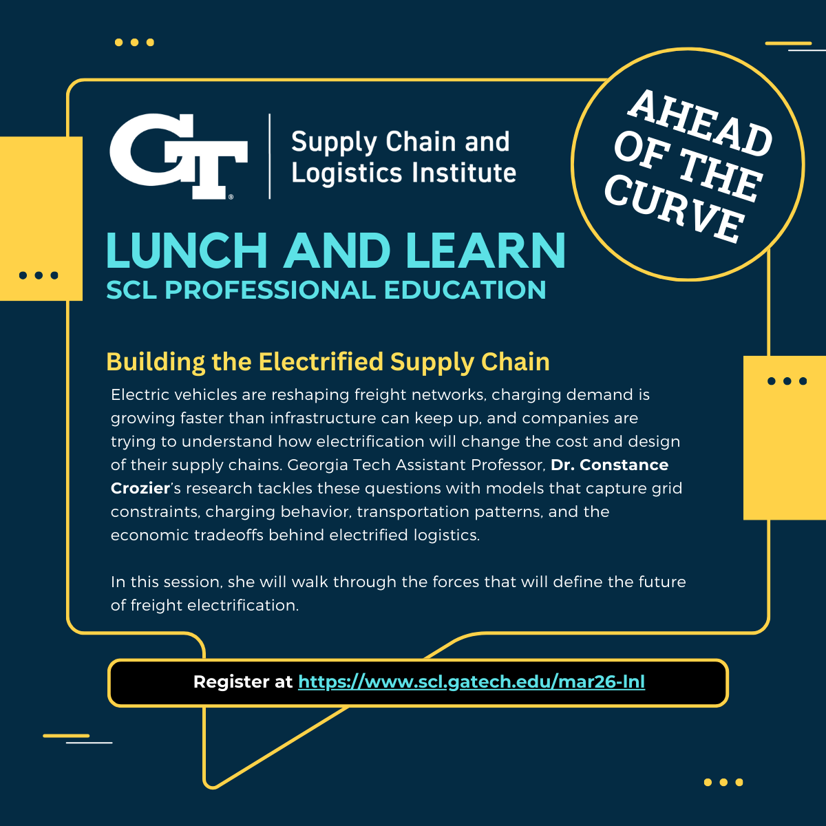 Electric vehicles are reshaping freight networks, charging demand is growing faster than infrastructure can keep up, and companies are trying to understand how electrification will change the cost and design of their supply chains. Georgia Tech Assistant Professor, Dr. Constance Crozier’s research tackles these questions with models that capture grid constraints, charging behavior, transportation patterns, and the economic tradeoffs behind electrified logistics. In this session, she will walk through the forces that will define the future of freight electrification. Afterwards, SCL Managing Director Chris Gaffney will share practical insights for operators considering charging investments, fleet transitions, or new network designs.