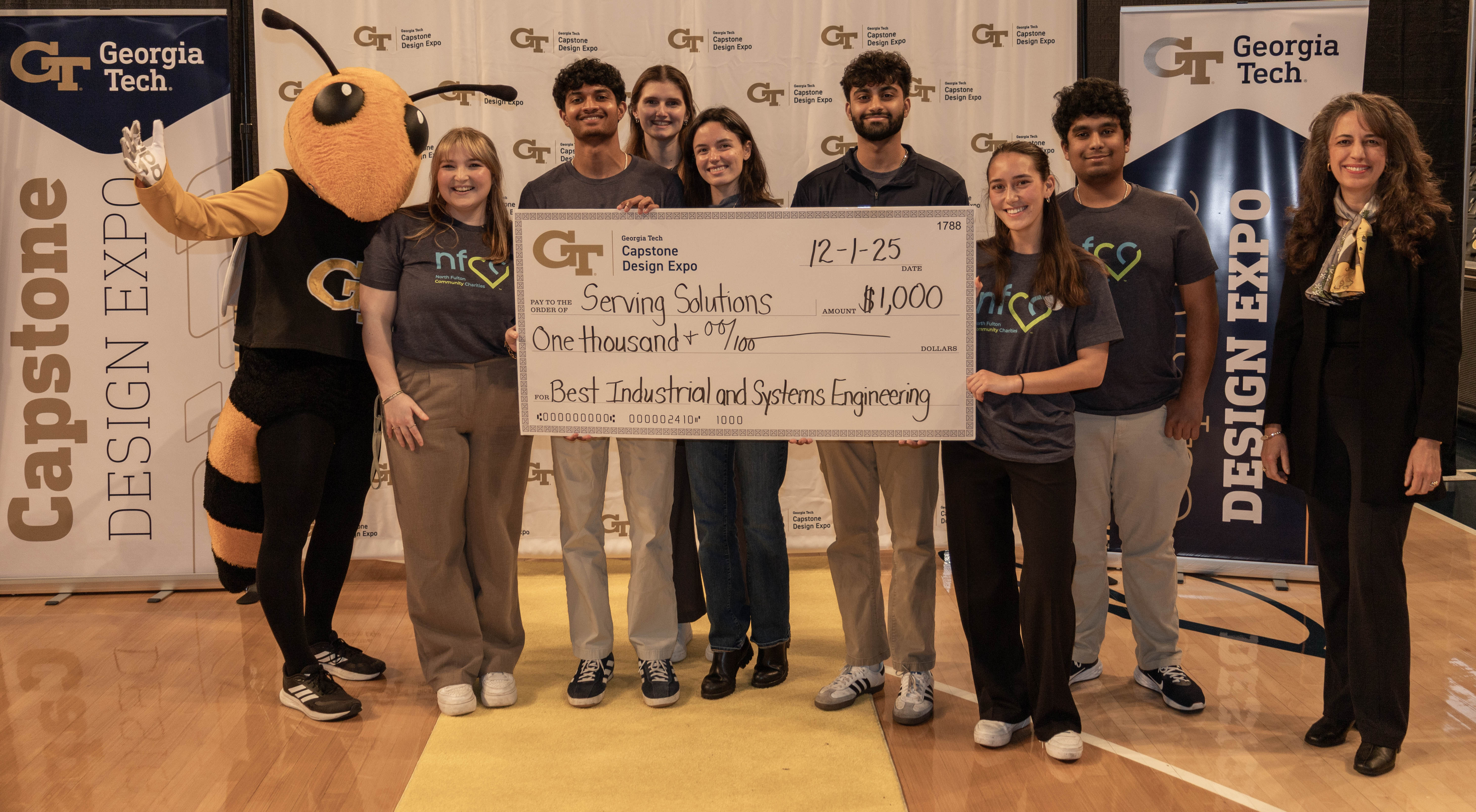 Capstone Design Expo monodisciplinary Industrial Engineering award went to Serving Solutions. The team partnered with North Fulton Community Charities (NFCC), a nonprofit dedicated to preventing hunger and homelessness, to design scalable systems for enhancing the overall customer experience.